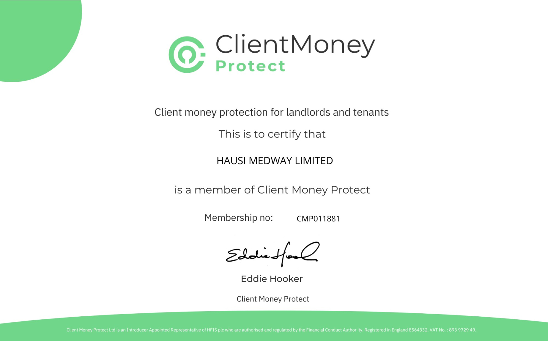 Client Money Protect Scheme is held with ‘Propertymark (CMP011881)